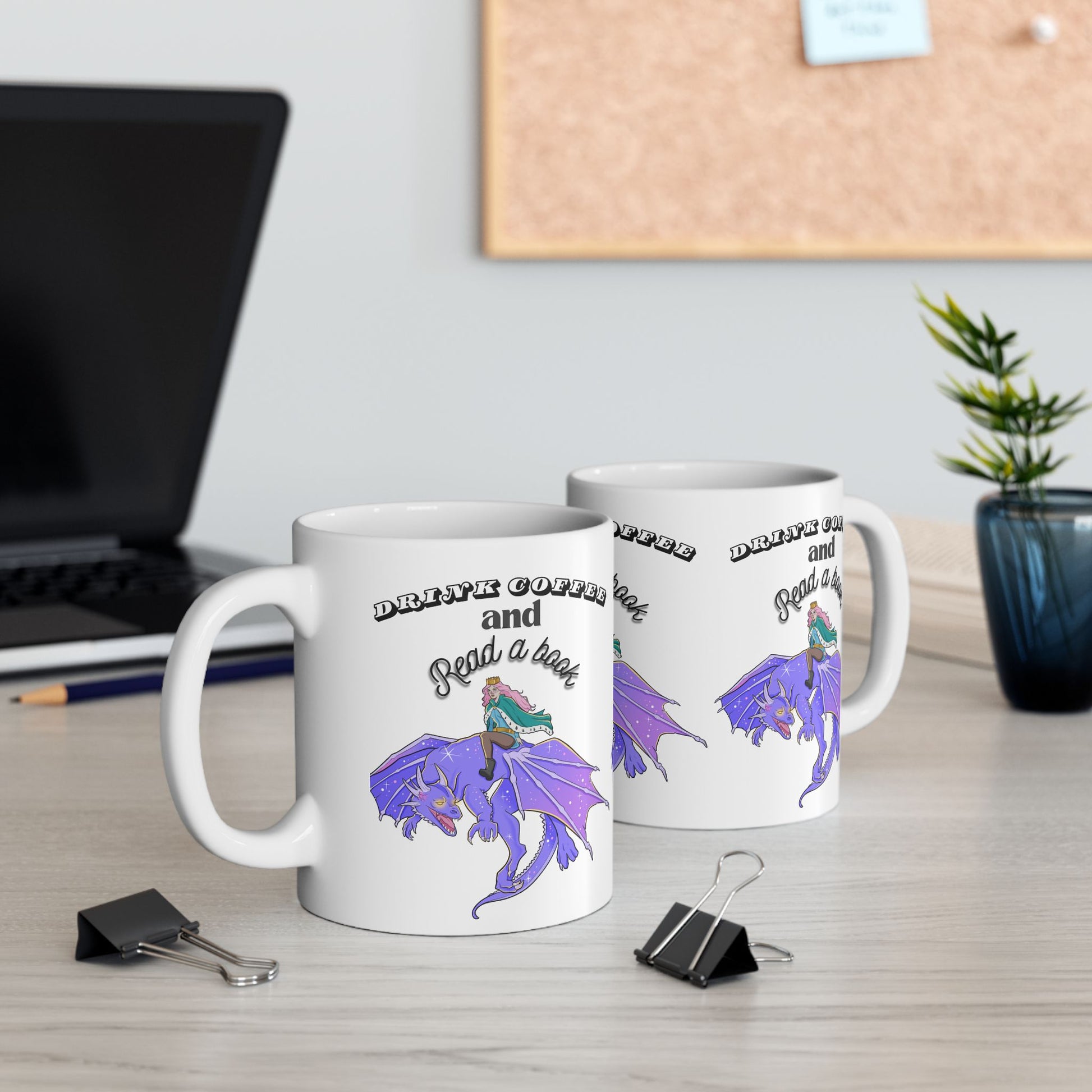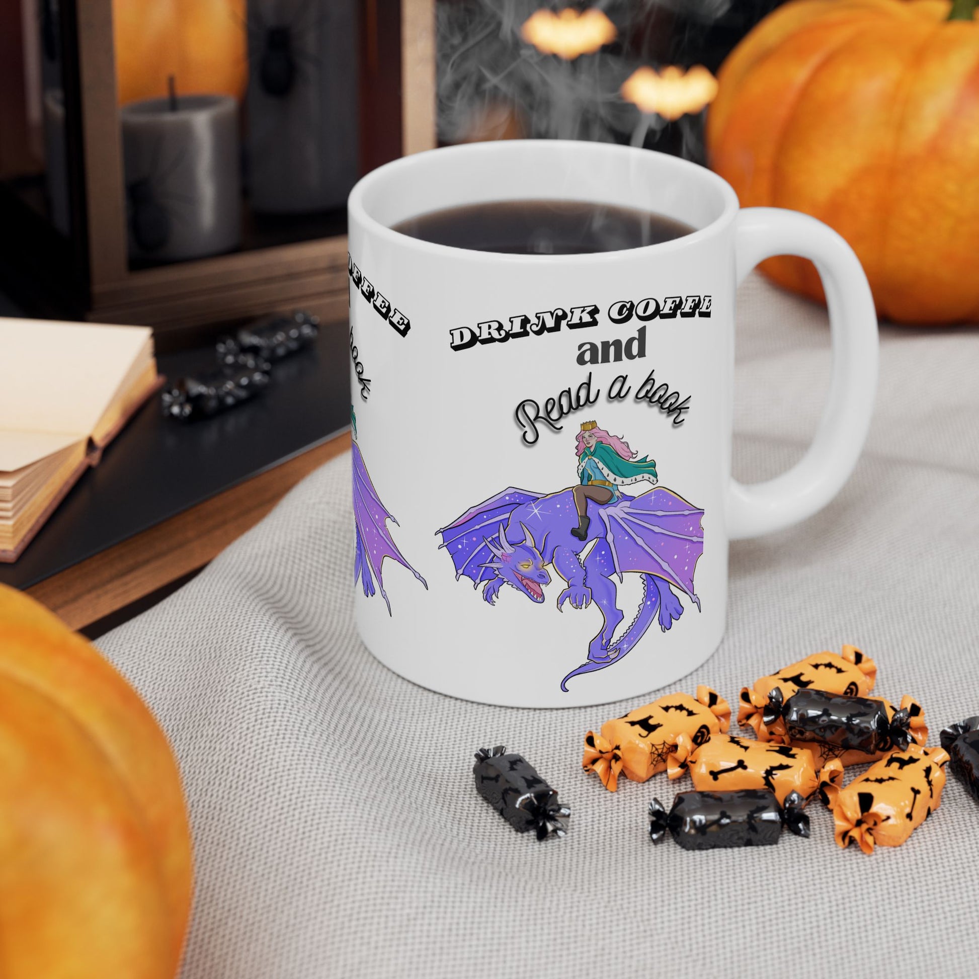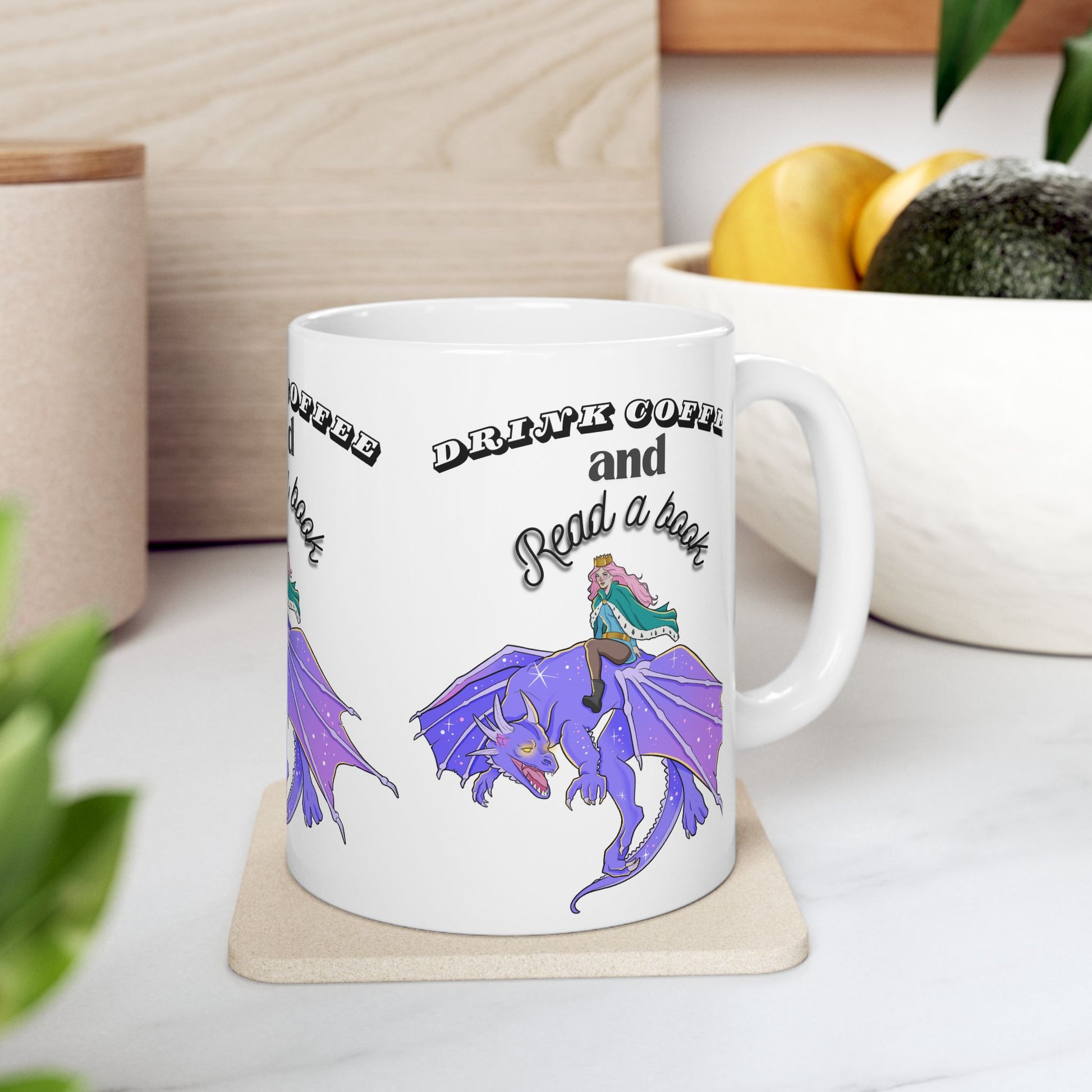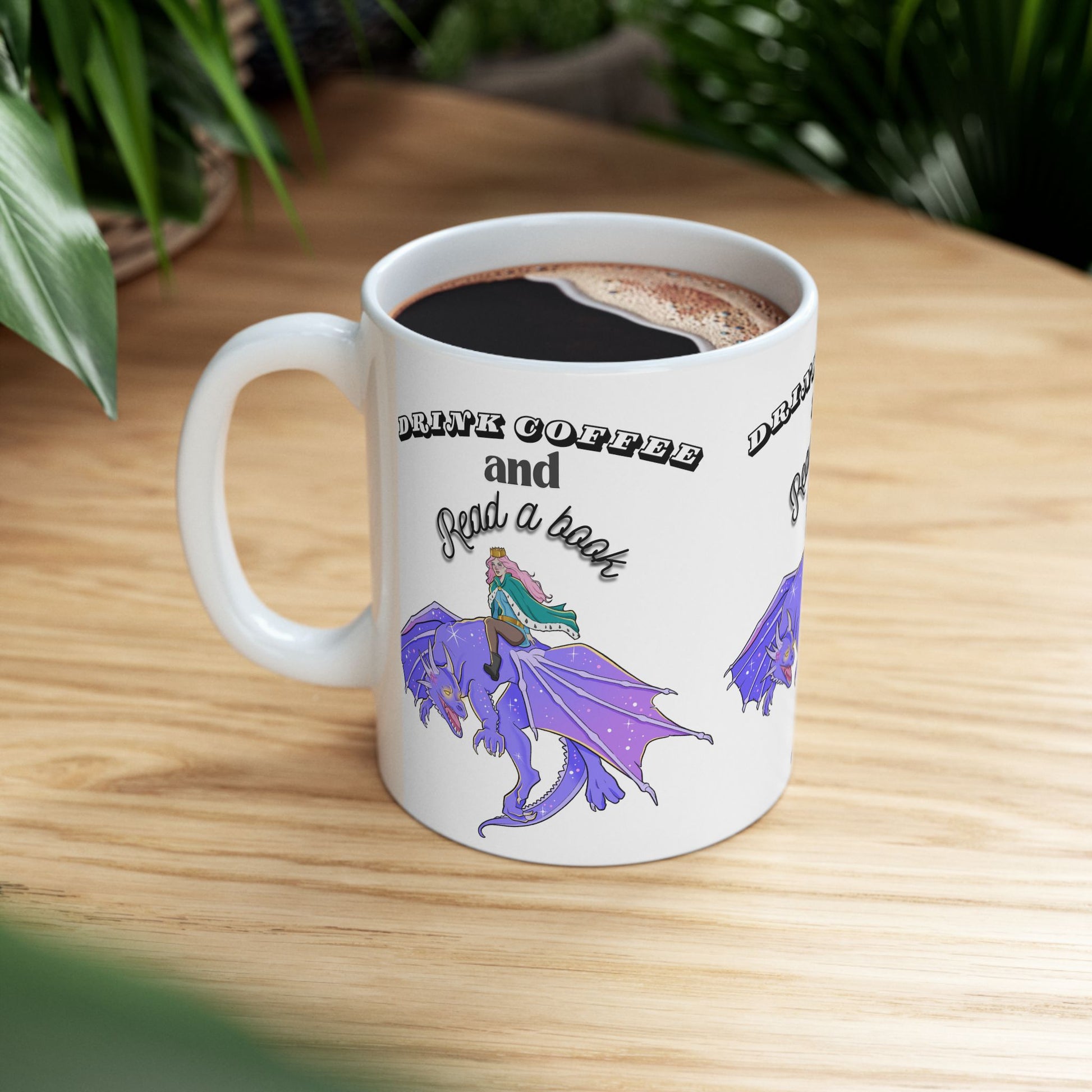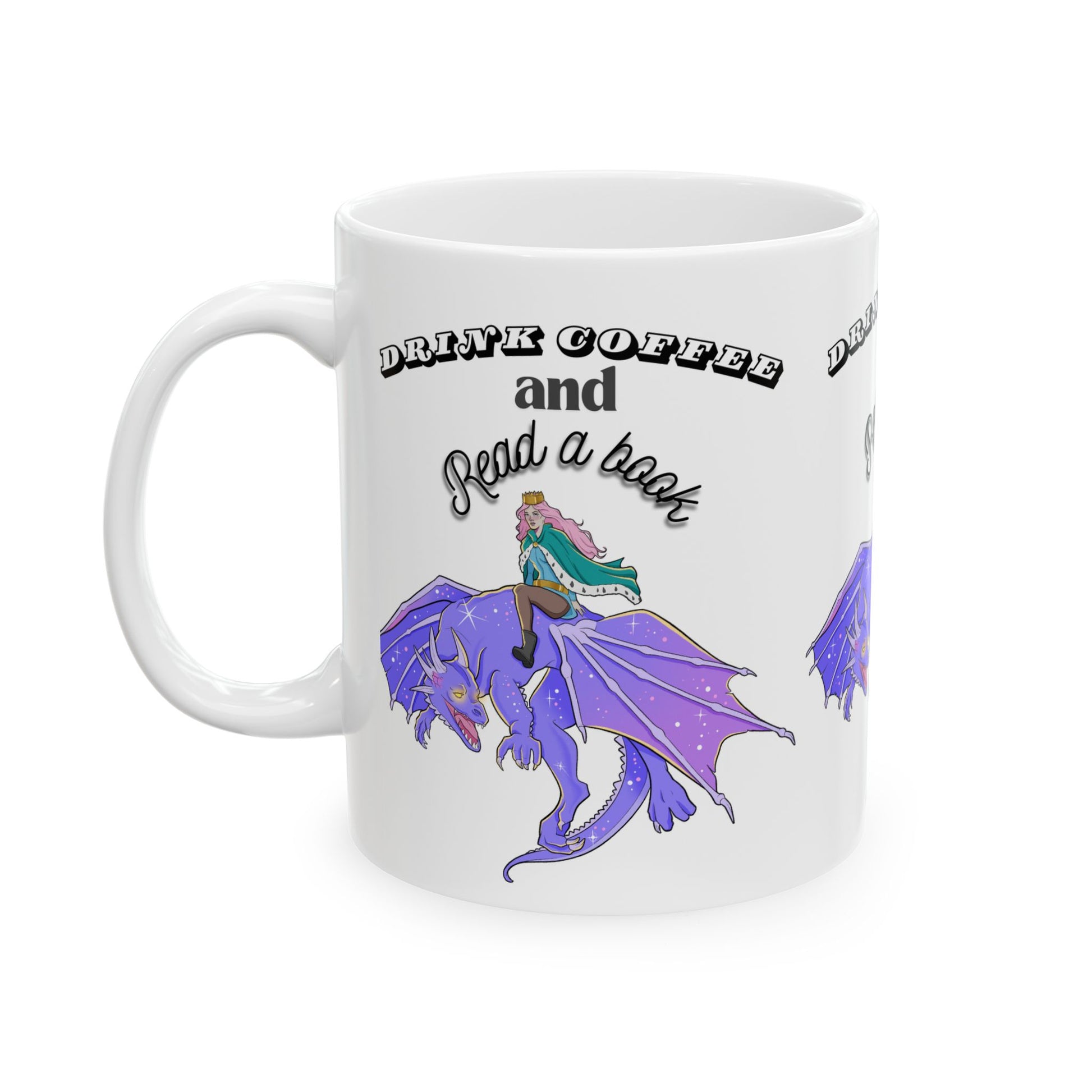 Ceramic Mug with Fantasy Design - Drink Coffee and Read a Book, Gift for Book Lovers, Fantasy Art Mug, Dragon Coffee Cup, Cozy Reading Gift