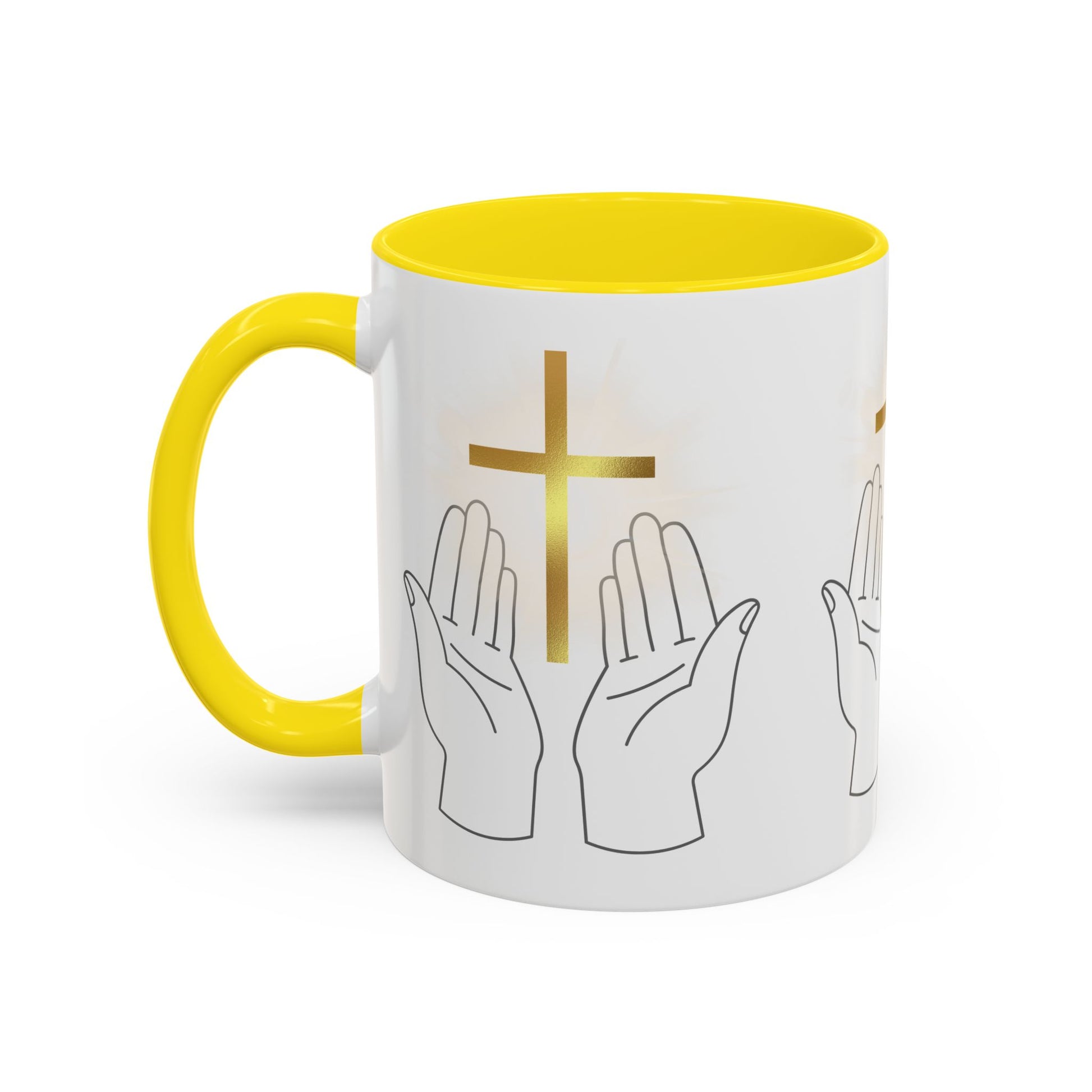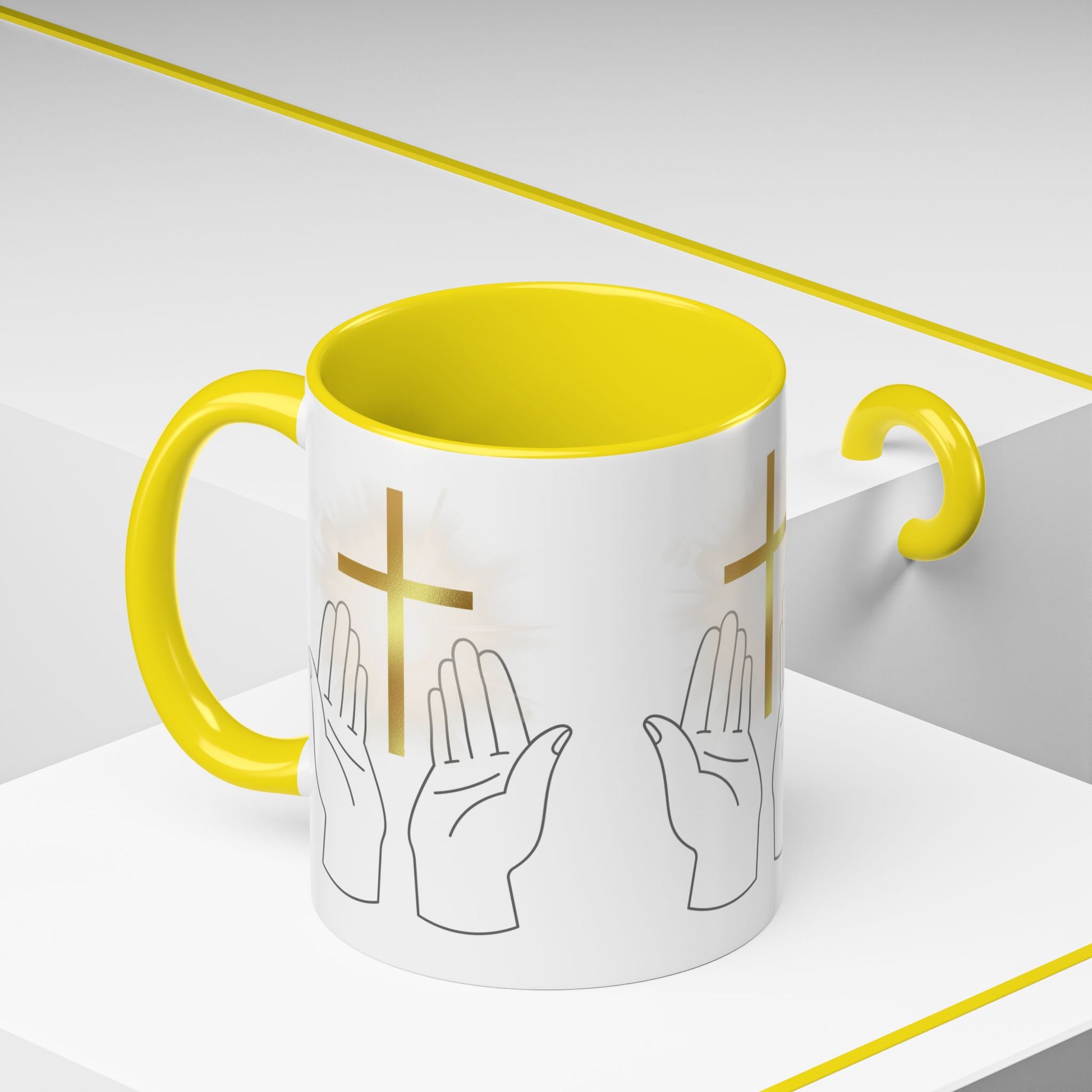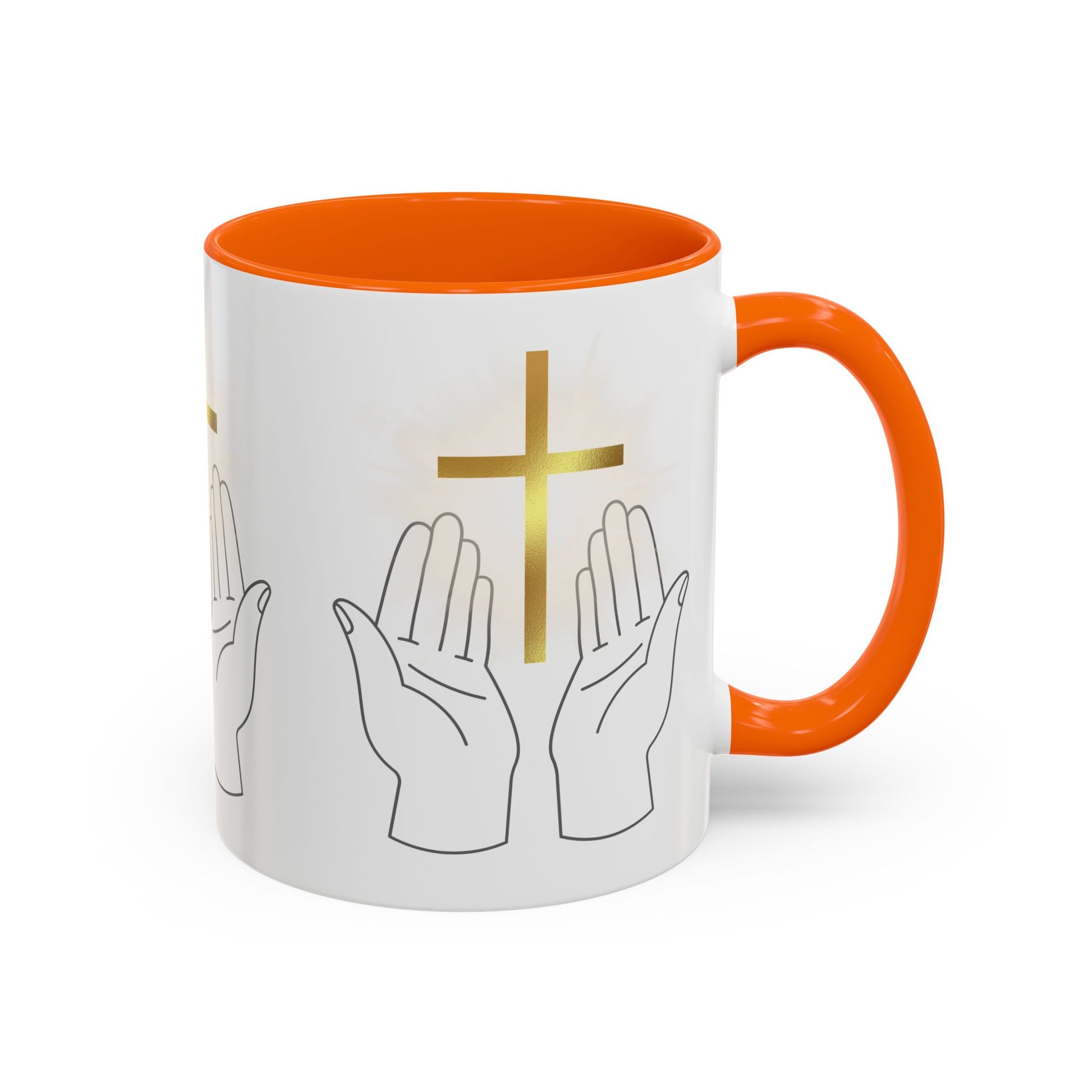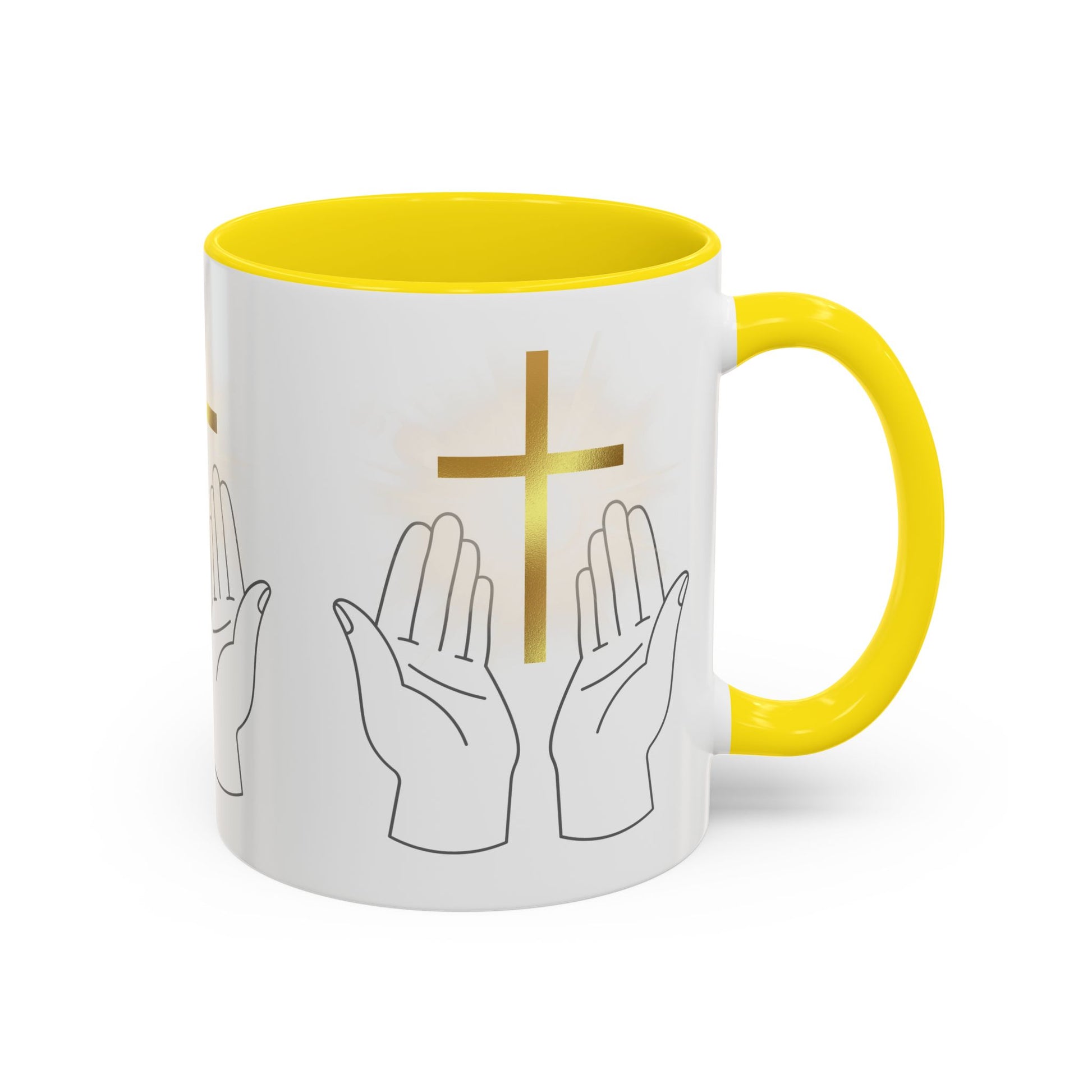 Enjoy your favorite beverages in style with this vibrant accent coffee mug. Its unique design features a striking golden cross surrounded by illustrated hands, creating a visually captivating centerpiece for any occasion. Perfect for daily use, this mug radiates warmth and inspiration, making it an ideal gift for those who appreciate spirituality or uplifting decor. Whether you're sipping coffee in the morning sunlight or unwinding with tea in the evening, this mug brings a touch of elegance to your routine. It’s the perfect choice for religious holidays, gatherings, or just moments of quiet reflection. Ideal for friends, family, or anyone looking to brighten their day with a meaningful touch.