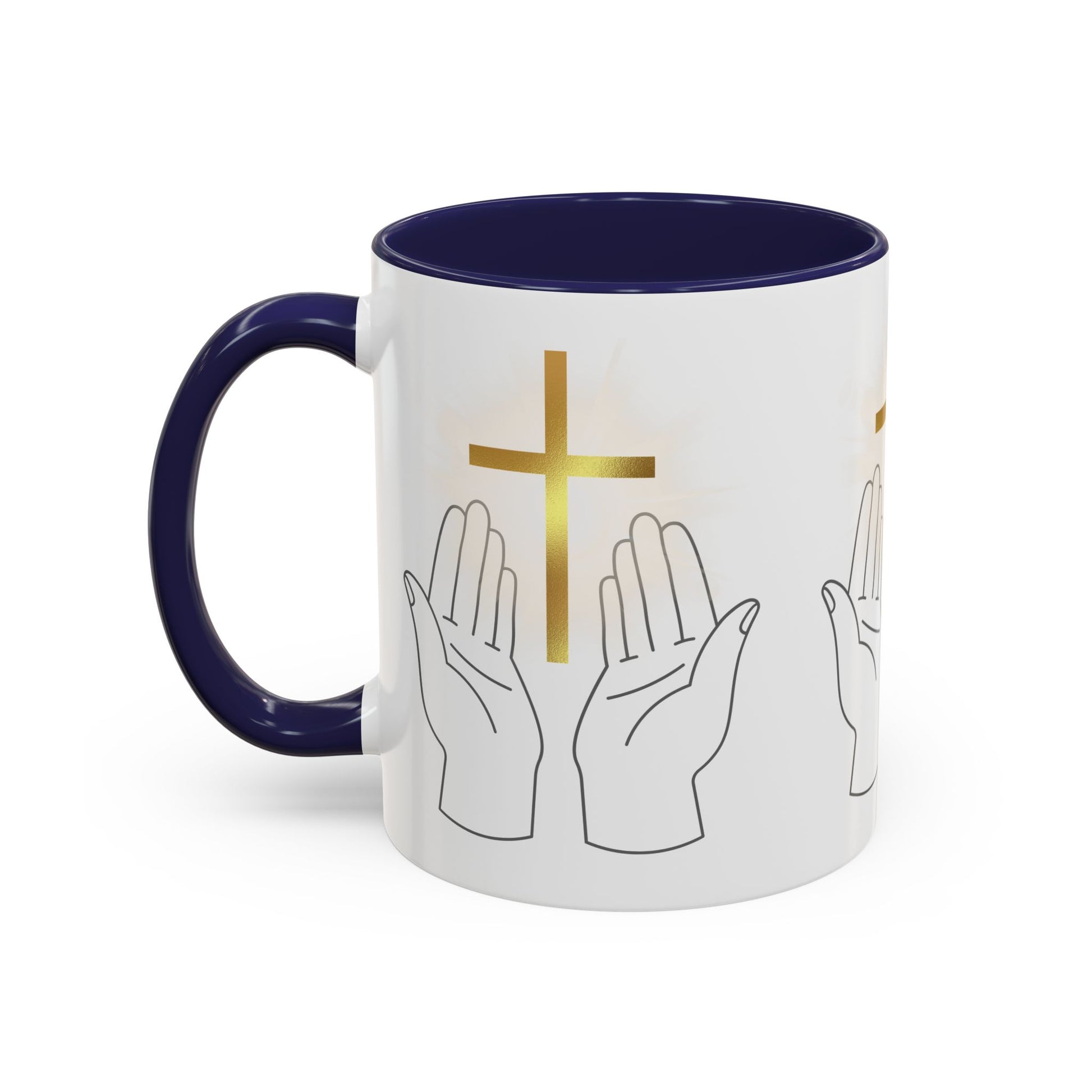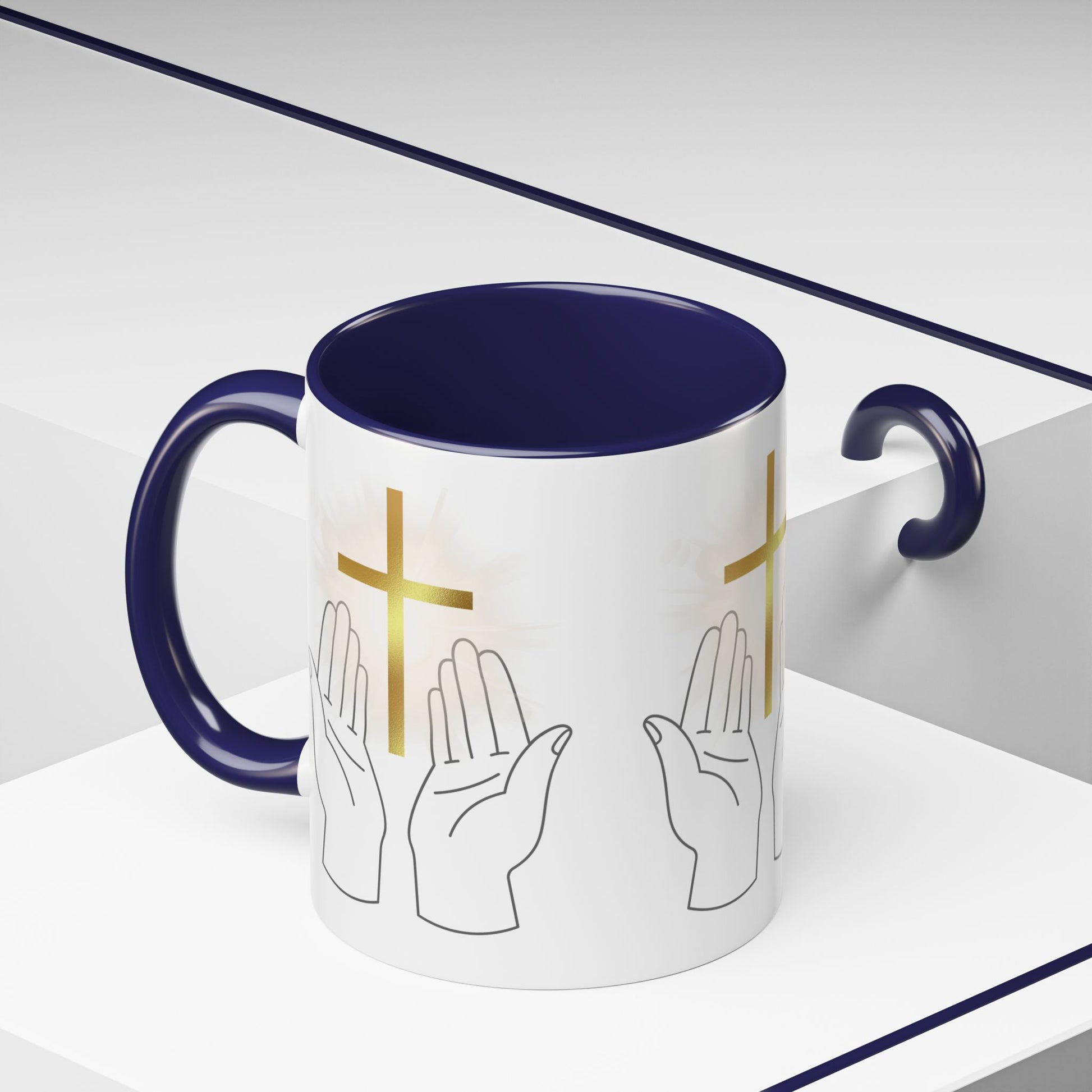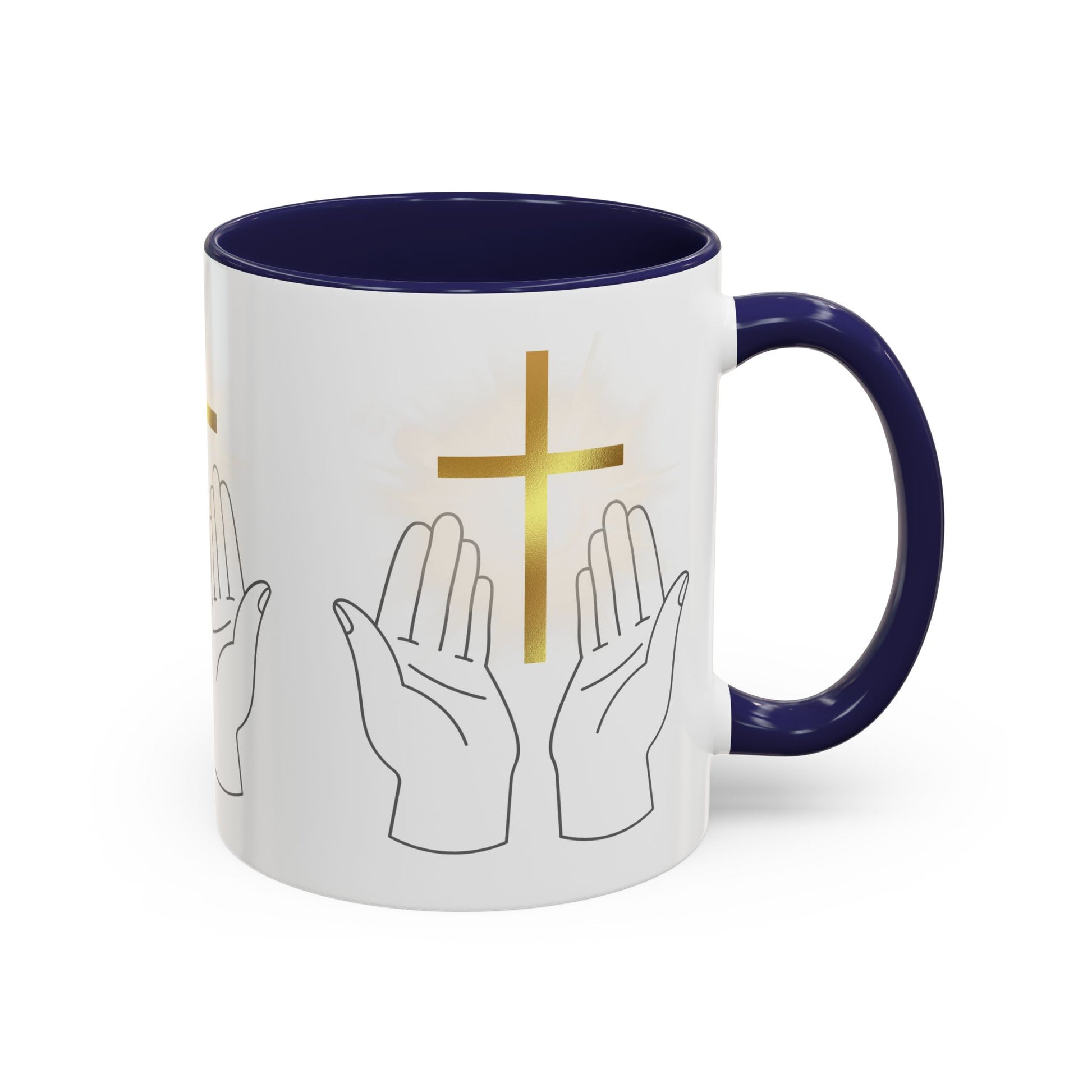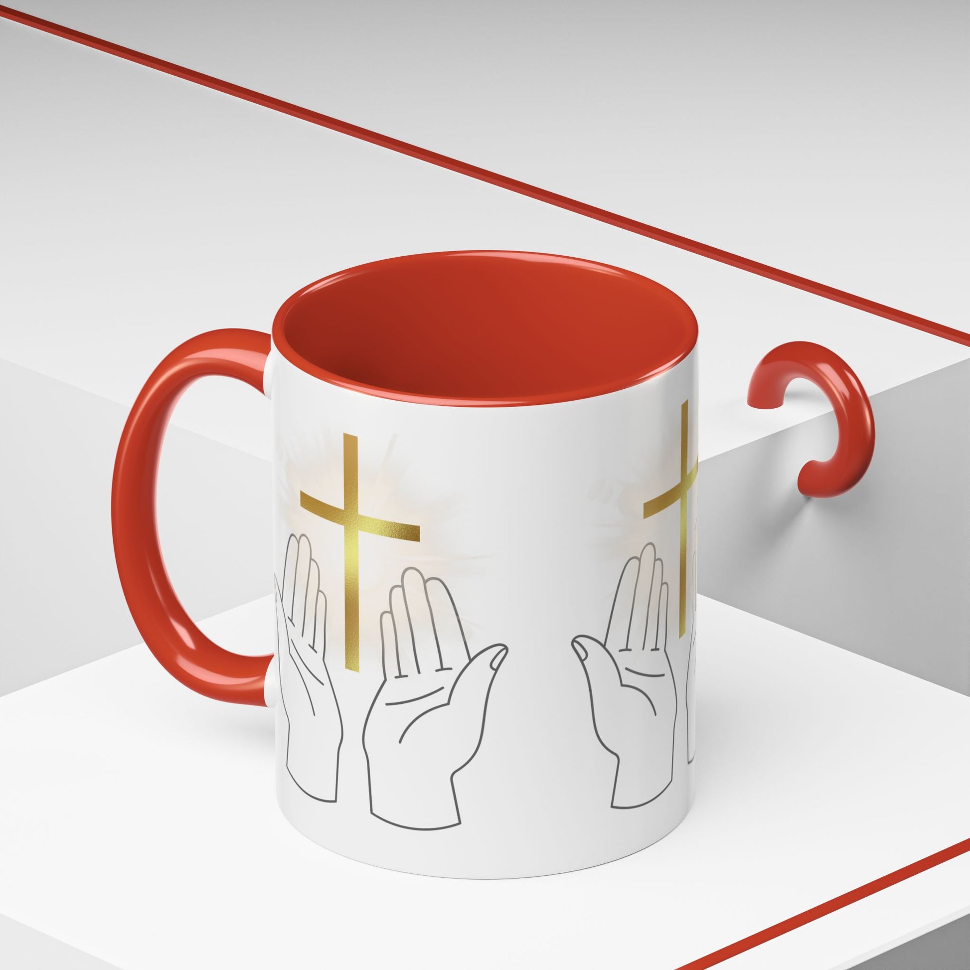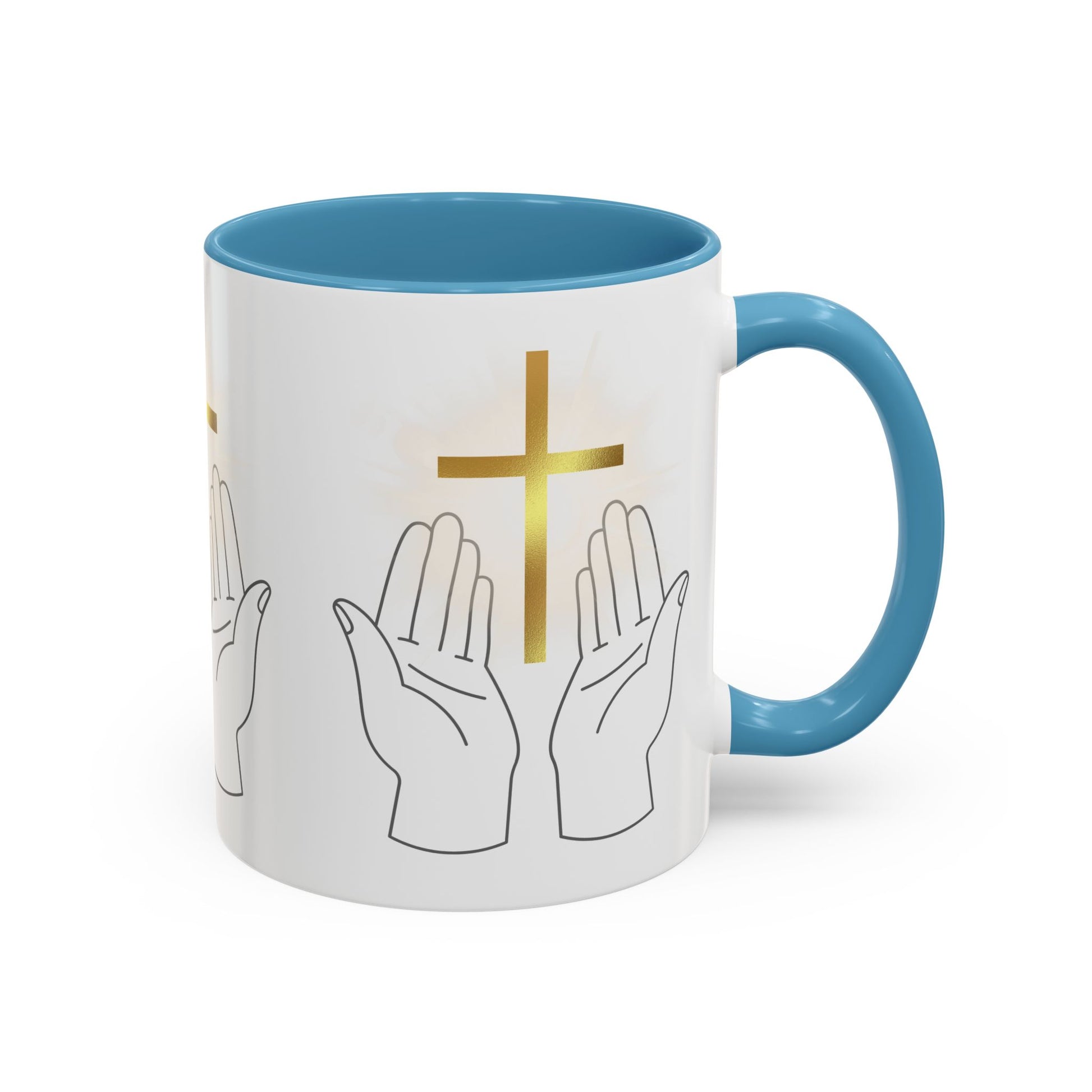 Enjoy your favorite beverages in style with this vibrant accent coffee mug. Its unique design features a striking golden cross surrounded by illustrated hands, creating a visually captivating centerpiece for any occasion. Perfect for daily use, this mug radiates warmth and inspiration, making it an ideal gift for those who appreciate spirituality or uplifting decor. Whether you're sipping coffee in the morning sunlight or unwinding with tea in the evening, this mug brings a touch of elegance to your routine. It’s the perfect choice for religious holidays, gatherings, or just moments of quiet reflection. Ideal for friends, family, or anyone looking to brighten their day with a meaningful touch.