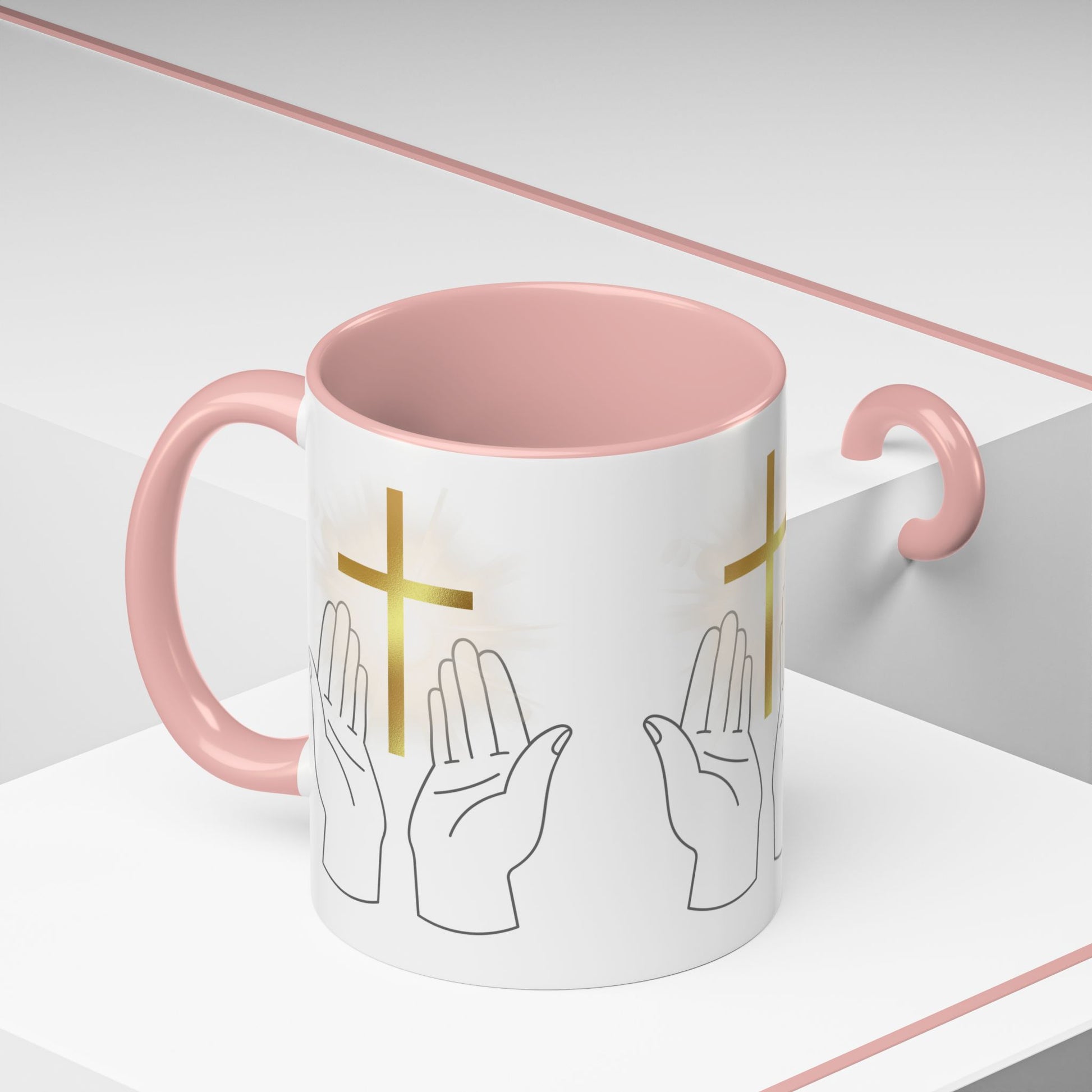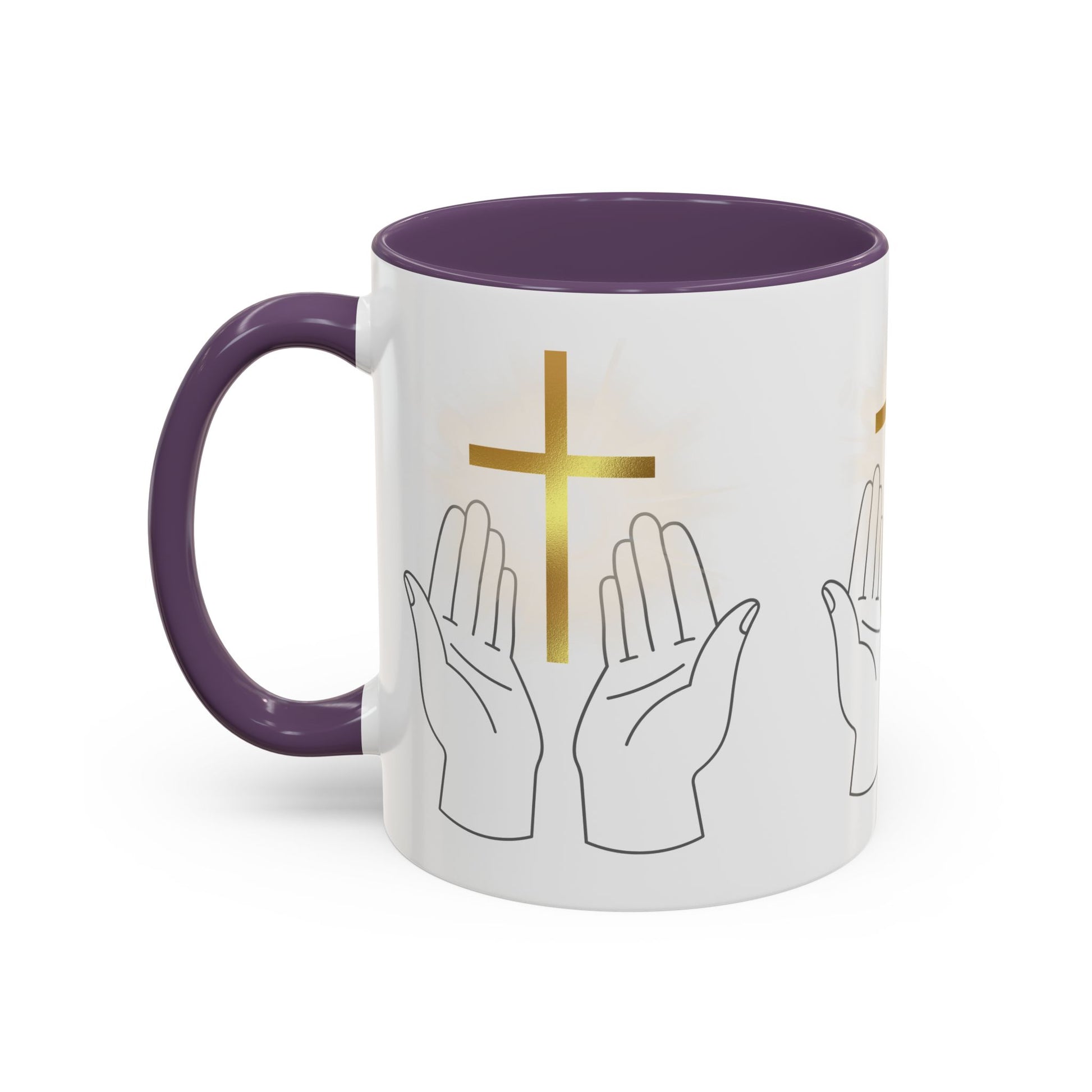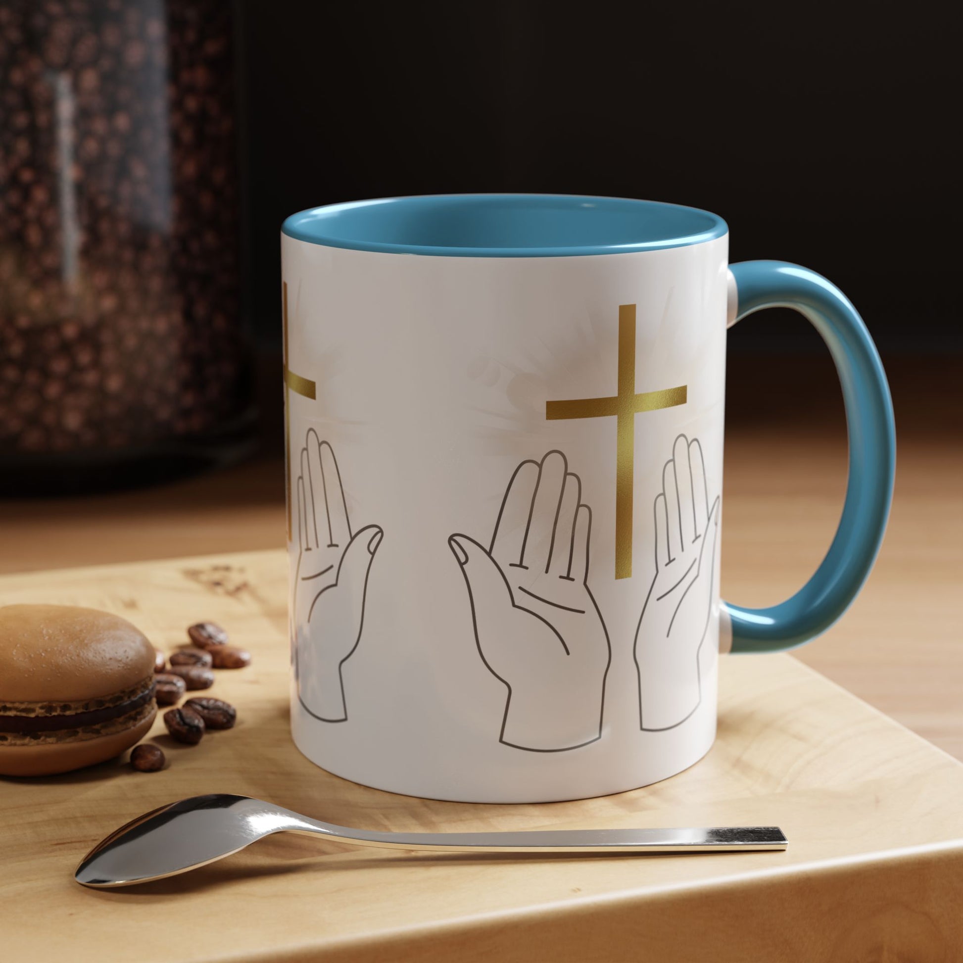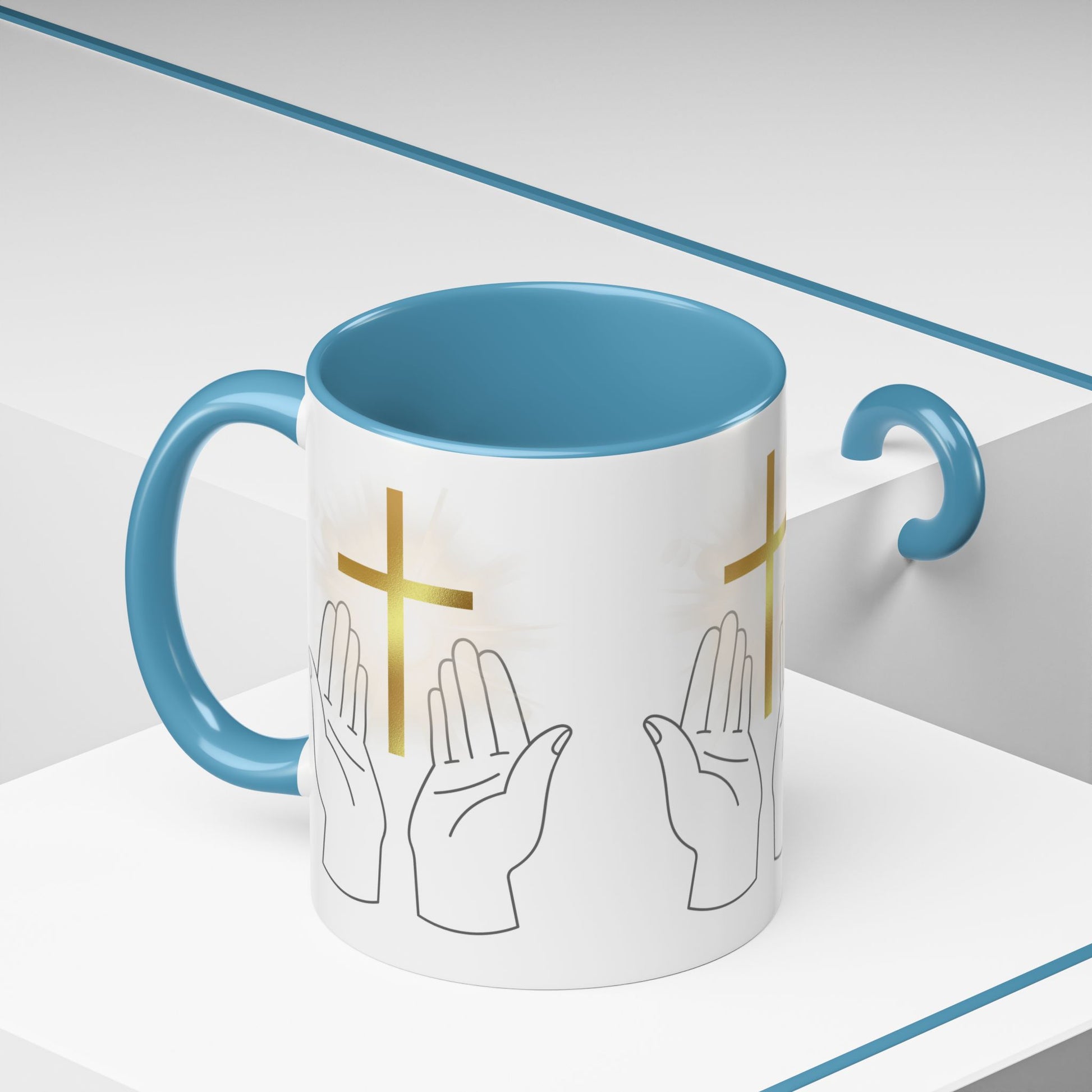 Enjoy your favorite beverages in style with this vibrant accent coffee mug. Its unique design features a striking golden cross surrounded by illustrated hands, creating a visually captivating centerpiece for any occasion. Perfect for daily use, this mug radiates warmth and inspiration, making it an ideal gift for those who appreciate spirituality or uplifting decor. Whether you're sipping coffee in the morning sunlight or unwinding with tea in the evening, this mug brings a touch of elegance to your routine. It’s the perfect choice for religious holidays, gatherings, or just moments of quiet reflection. Ideal for friends, family, or anyone looking to brighten their day with a meaningful touch.