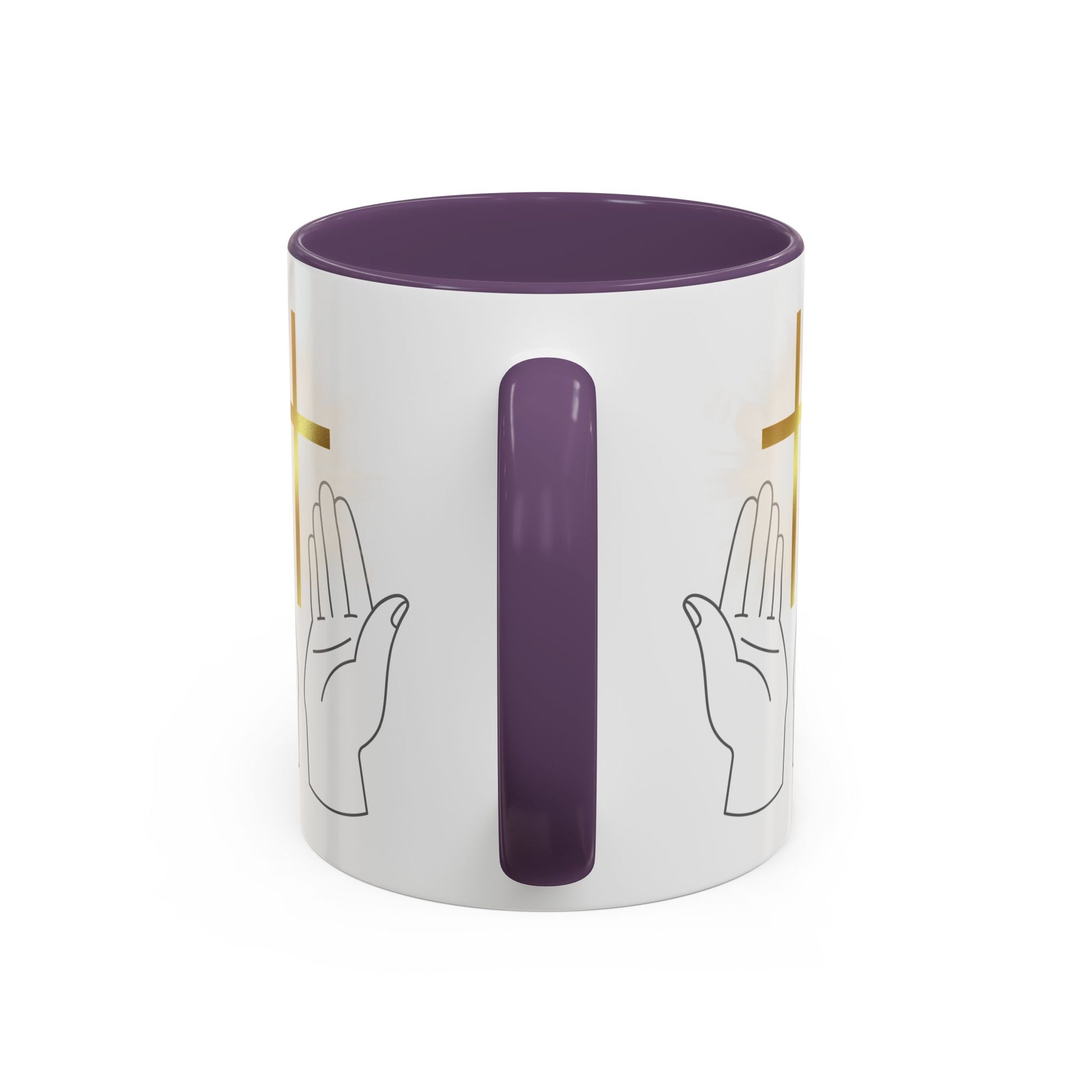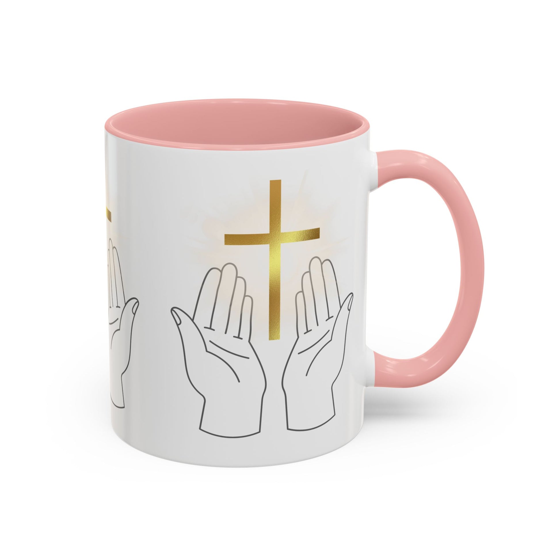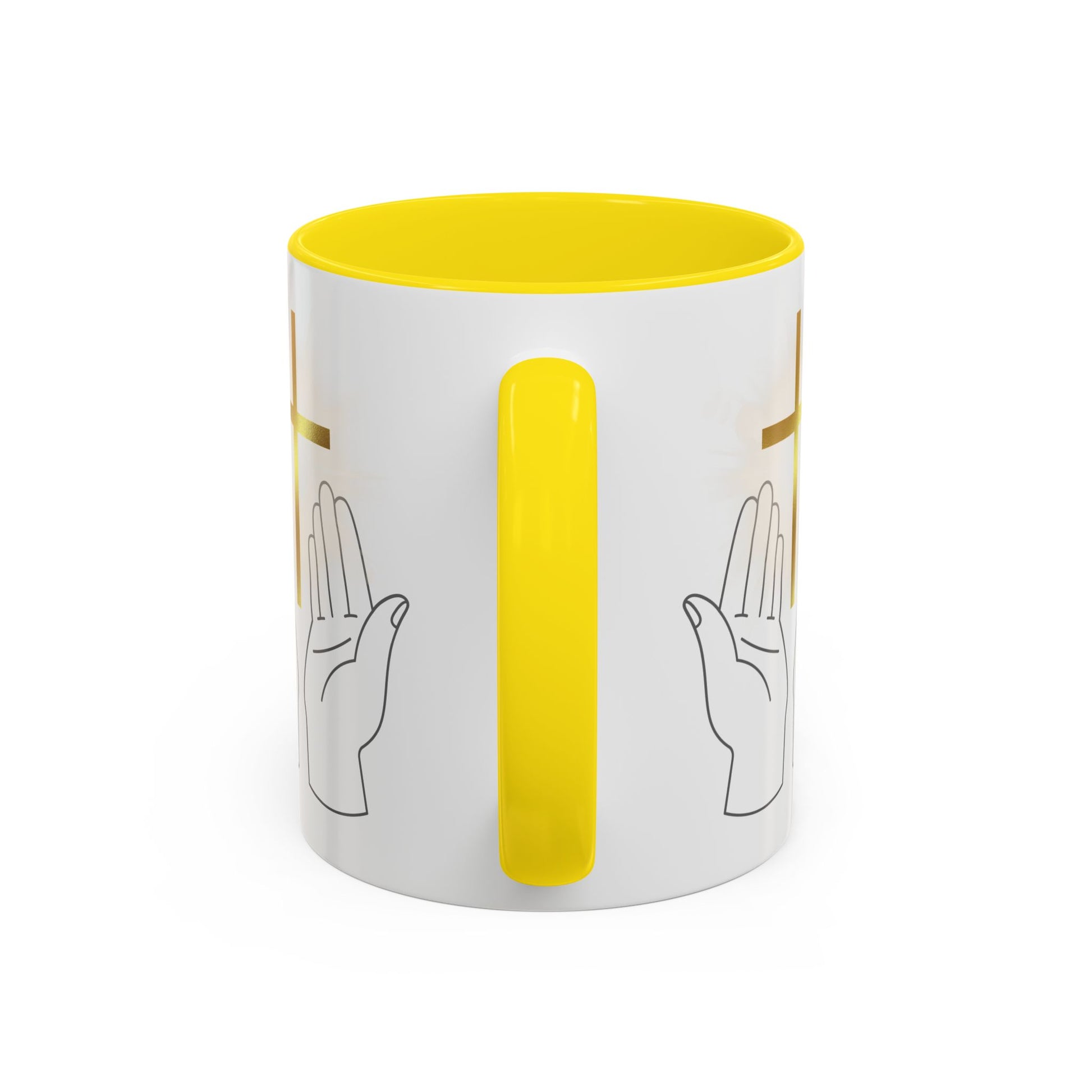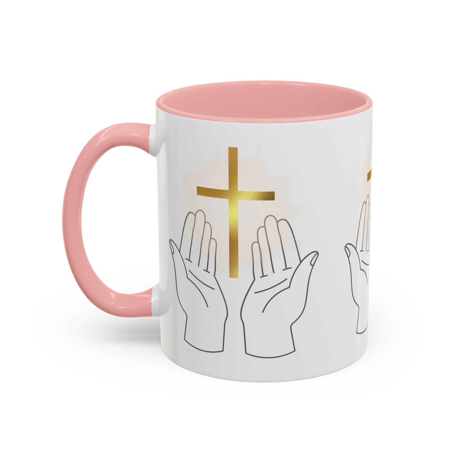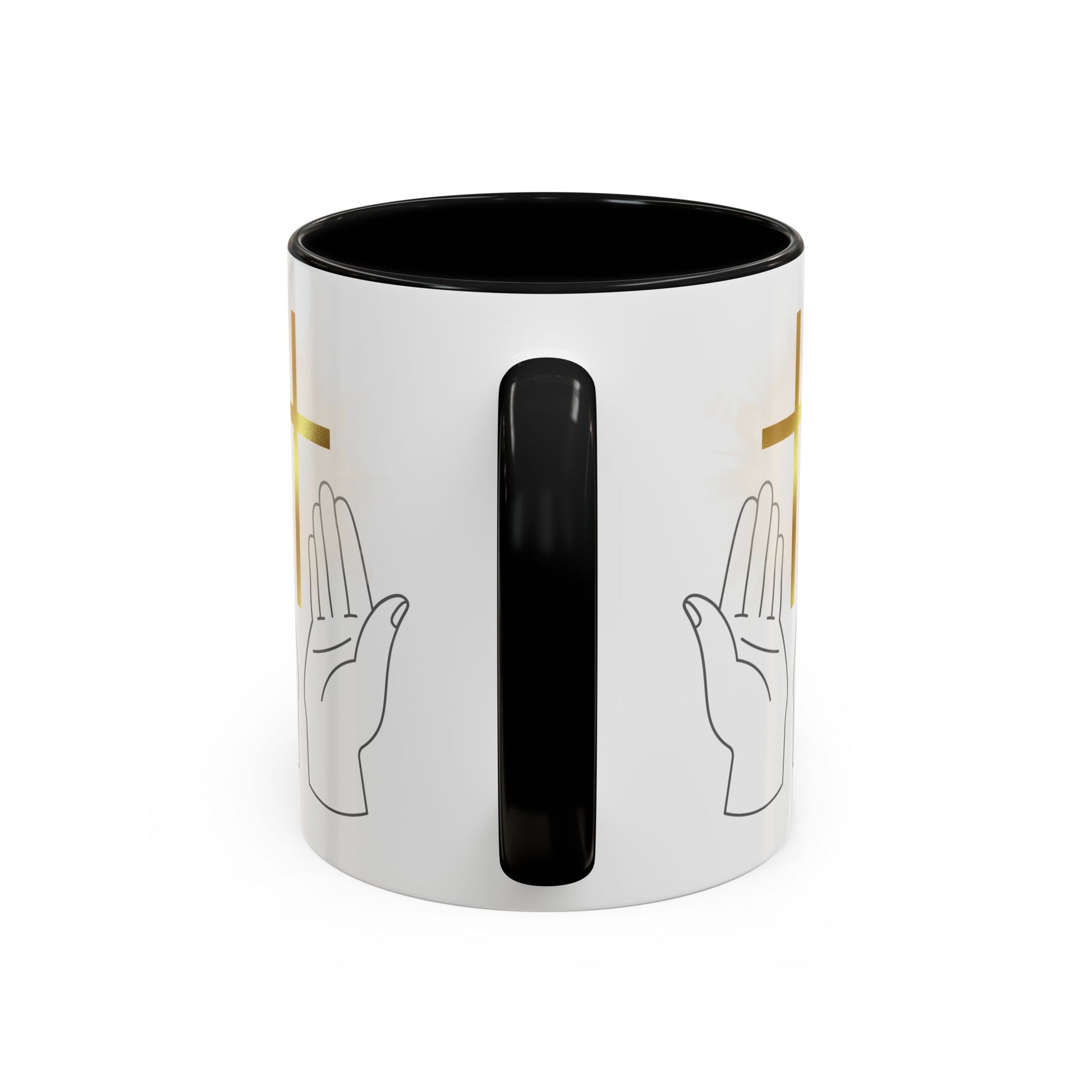 Enjoy your favorite beverages in style with this vibrant accent coffee mug. Its unique design features a striking golden cross surrounded by illustrated hands, creating a visually captivating centerpiece for any occasion. Perfect for daily use, this mug radiates warmth and inspiration, making it an ideal gift for those who appreciate spirituality or uplifting decor. Whether you're sipping coffee in the morning sunlight or unwinding with tea in the evening, this mug brings a touch of elegance to your routine. It’s the perfect choice for religious holidays, gatherings, or just moments of quiet reflection. Ideal for friends, family, or anyone looking to brighten their day with a meaningful touch.