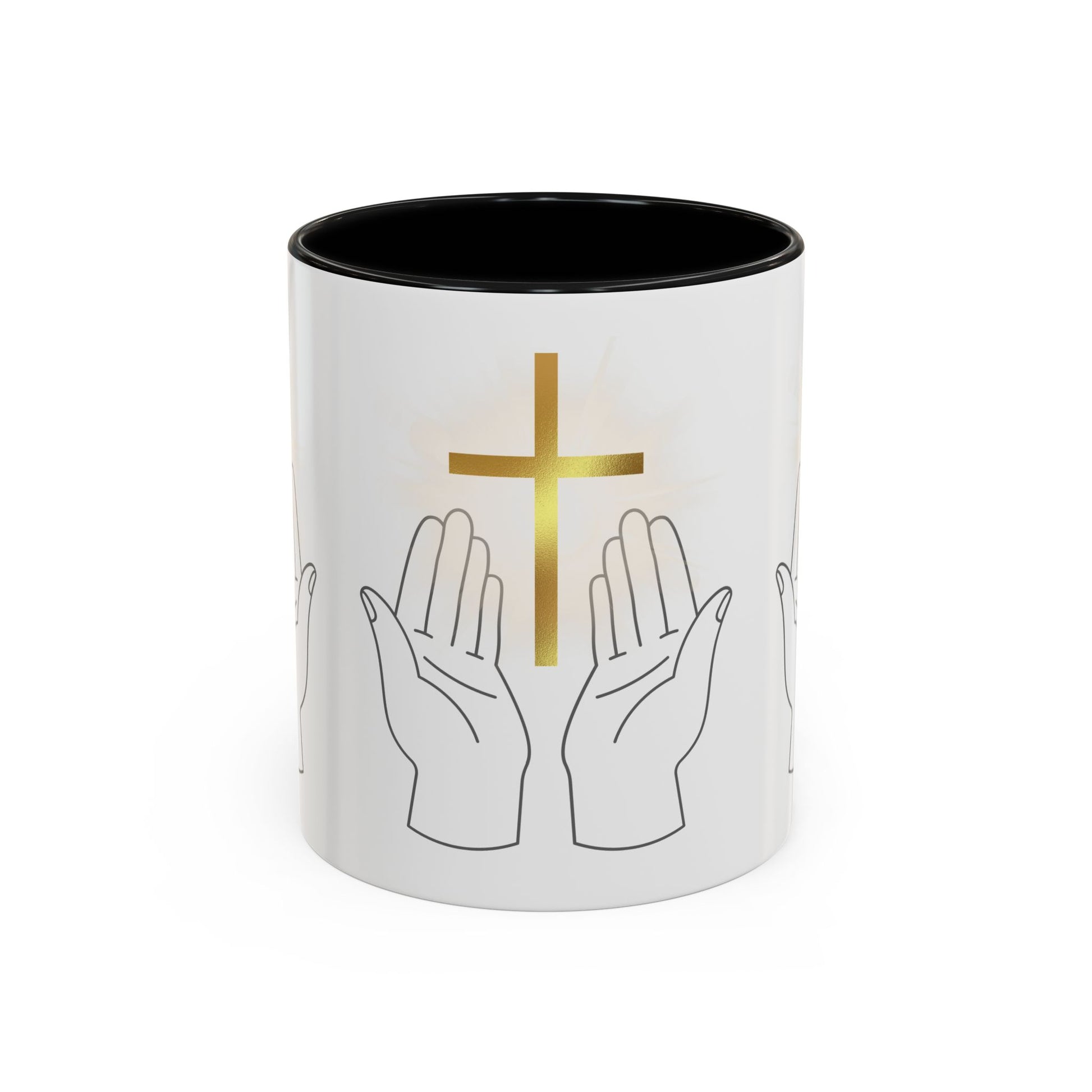 Faith-Inspired Accent Coffee Mug with Hands and Cross - Perfect Gift for Spiritual Gatherings, Daily Motivation, and Religious Celebrations